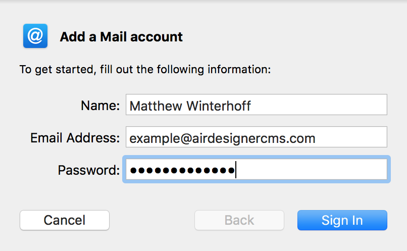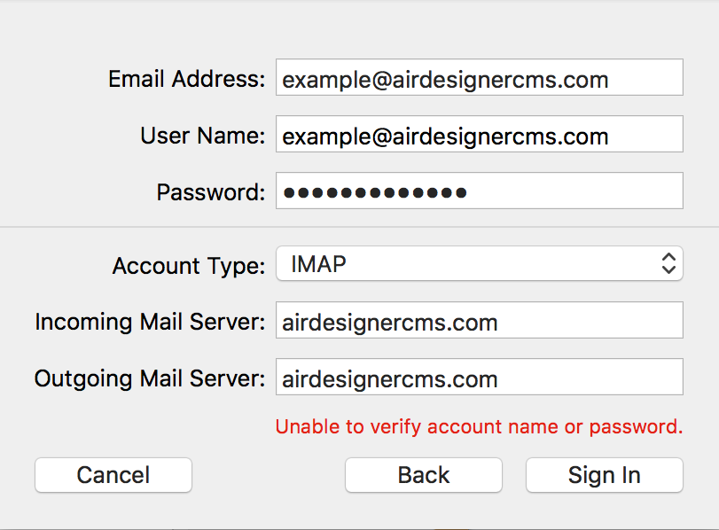 Password: Be sure this is the correct one, first before attempting, if uncertain test it by checking your email via Webmail here: https://airdesignercms.com/webmail/ Failure to enter your correct password may get your IP banned from the server, contact support for further details.
